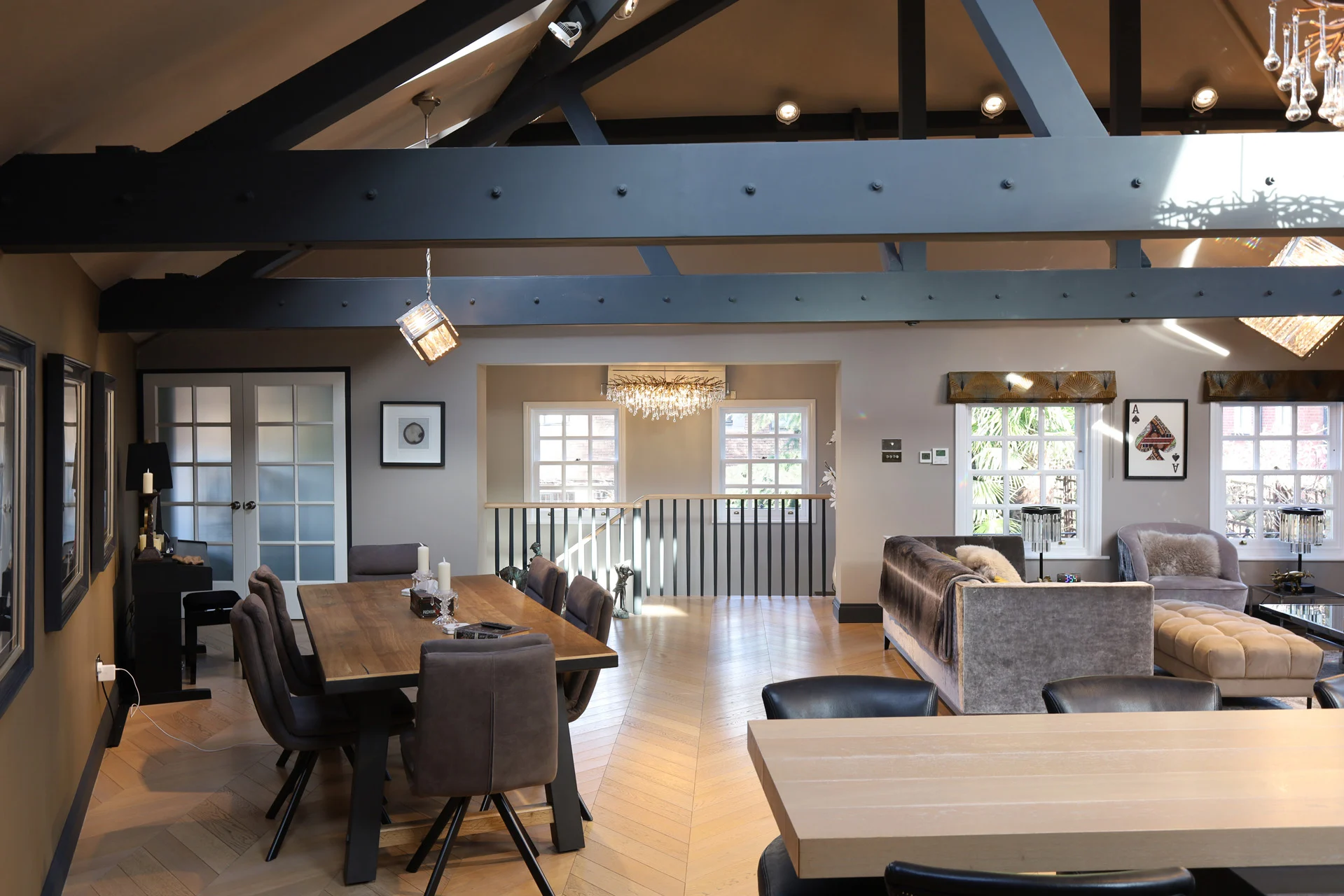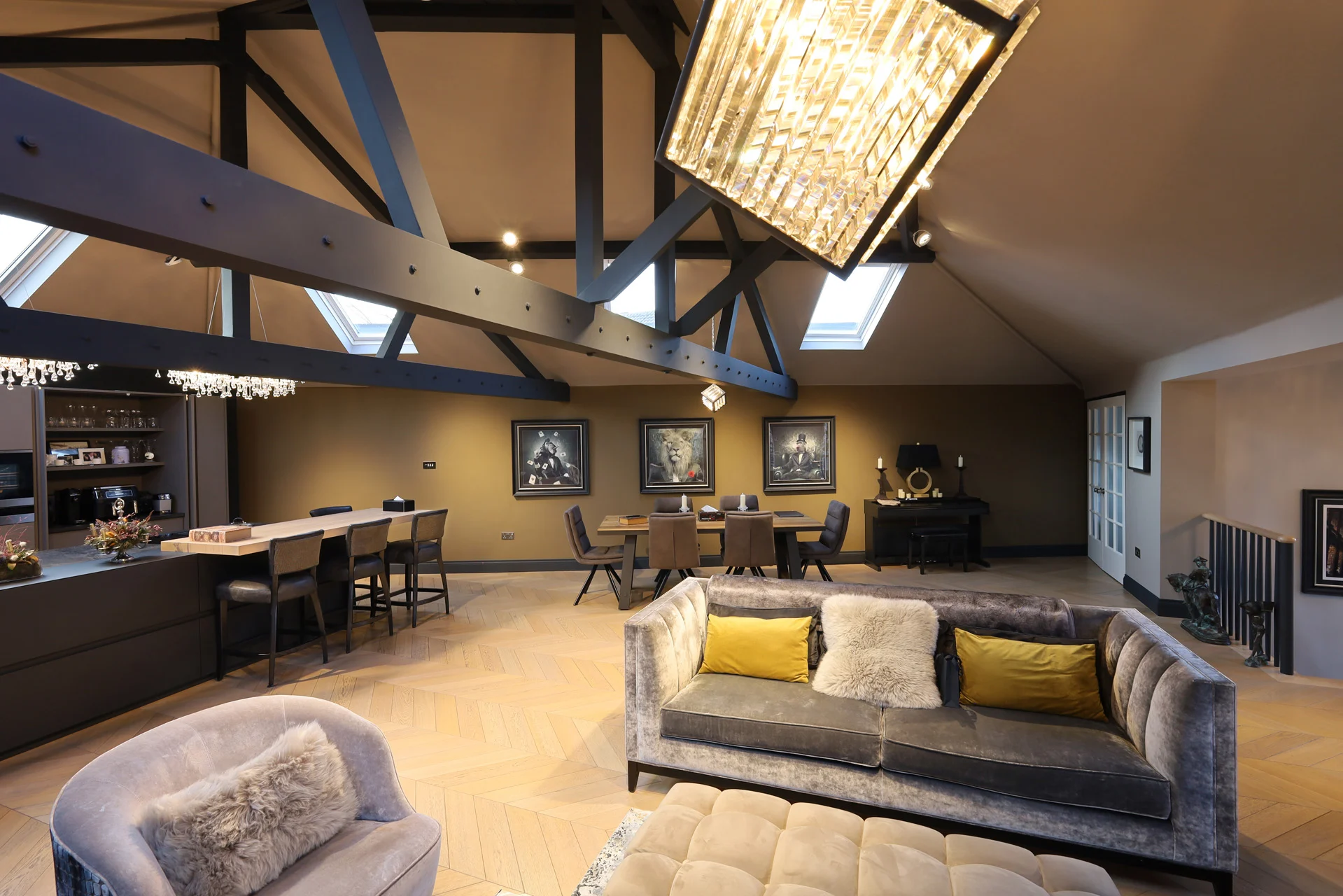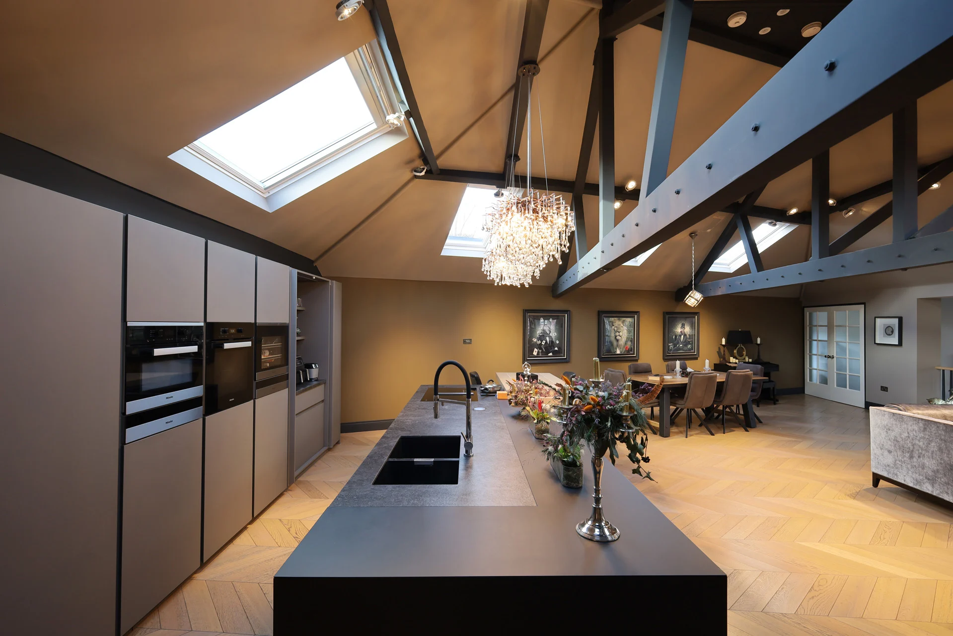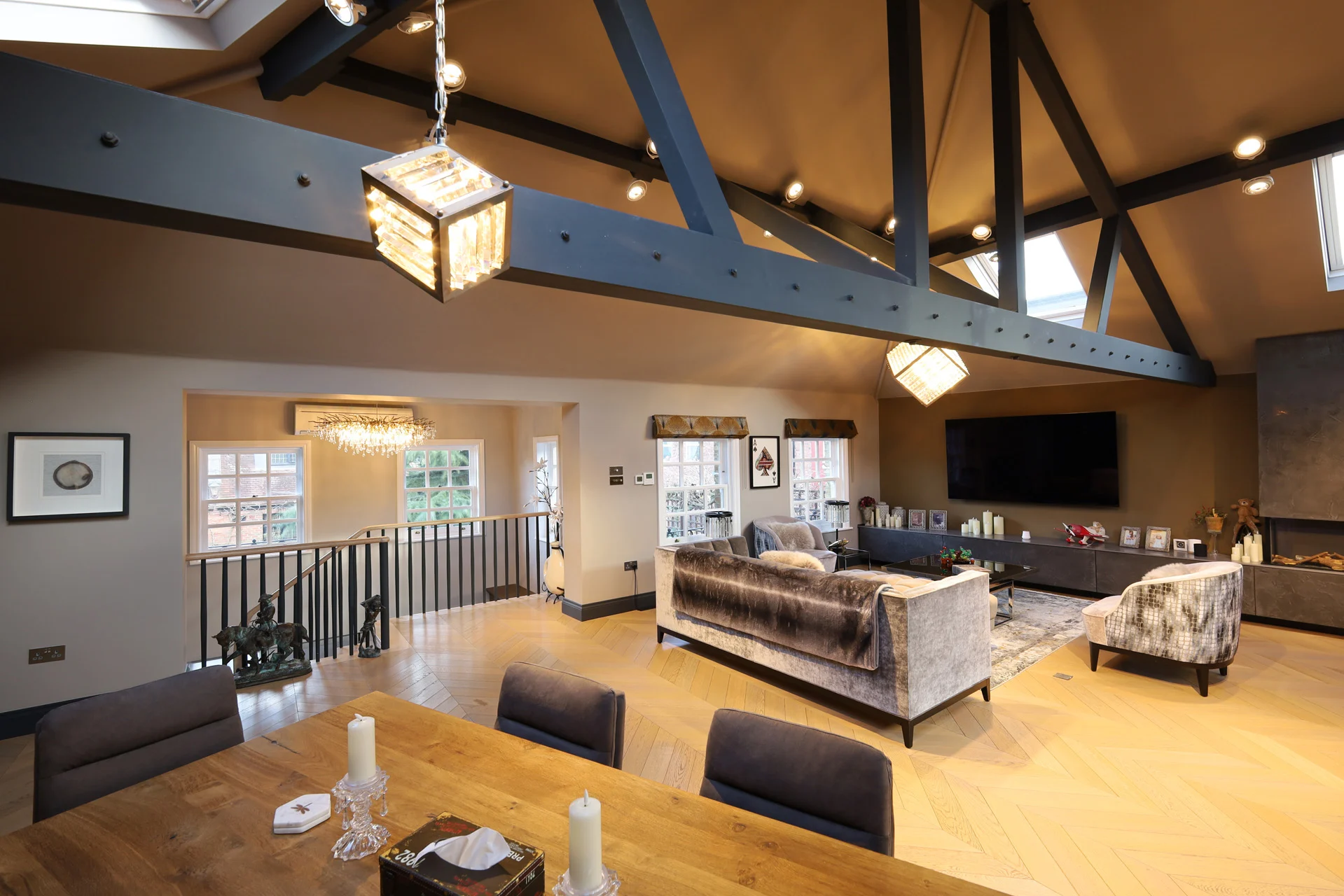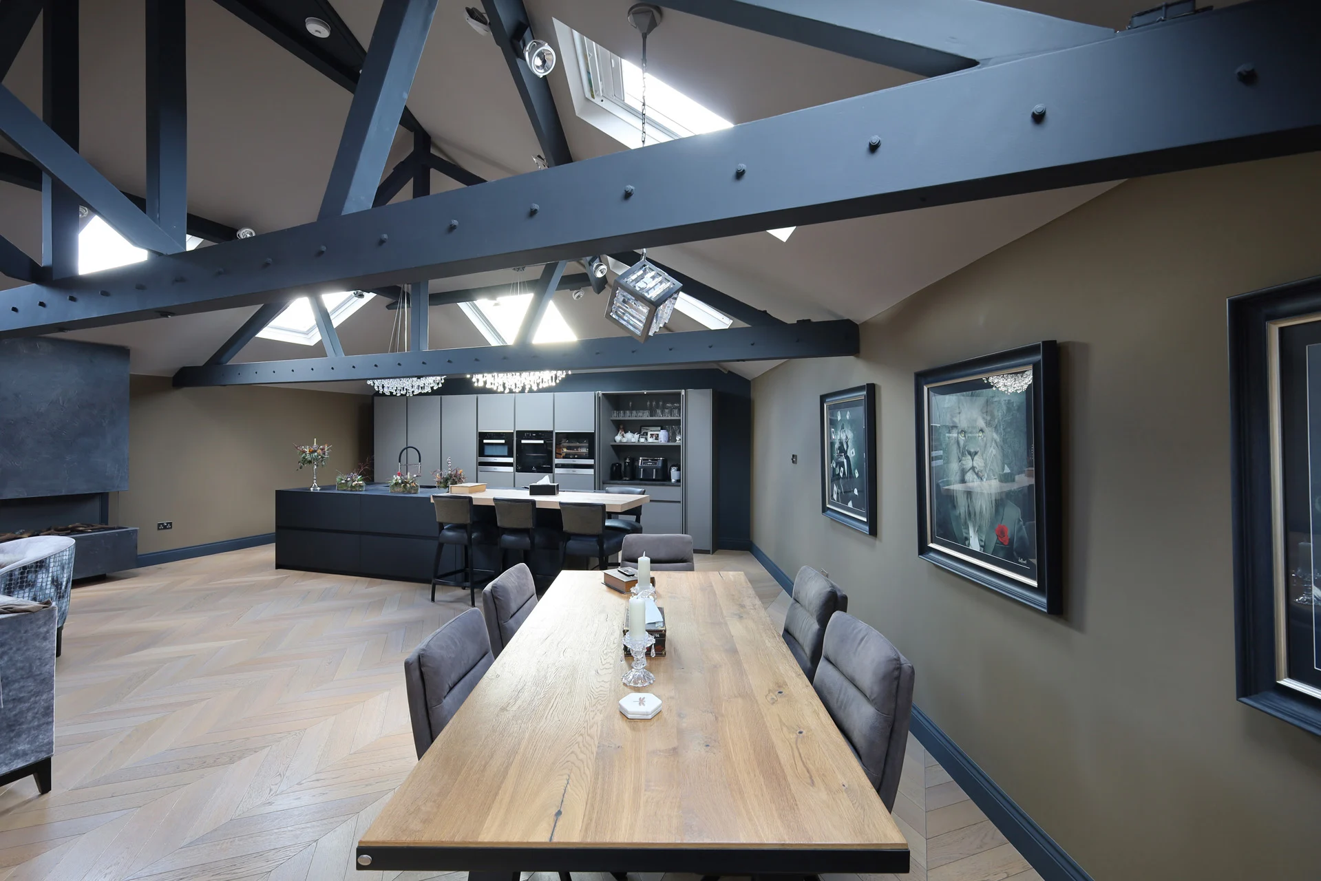 The original roof trusses in the living areas were exposed to celebrate the industrial roots of the original building, and supporting walls removed to enable an unobstructed open plan with defined zones for a variety of activities to take place without feeling cut-off.