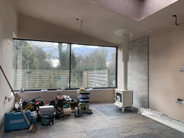 It’s so great to see traditional stove in place within the timber framed, K-rend rear extension!